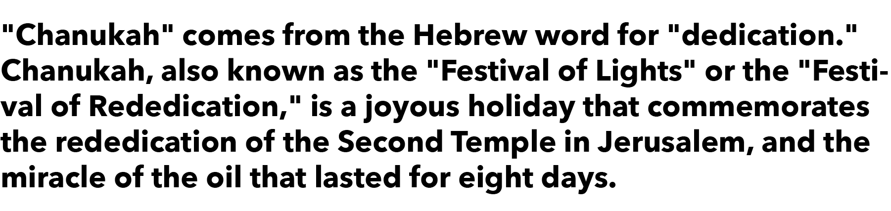 “Chanukah” comes from the Hebrew word for “dedication.” Chanukah, also known as the “Festival of Lights” or the “Festival of Rededication,” is a joyous holiday that commemorates the rededication of the Second Temple in Jerusalem, and the miracle of the oil that lasted for eight days.