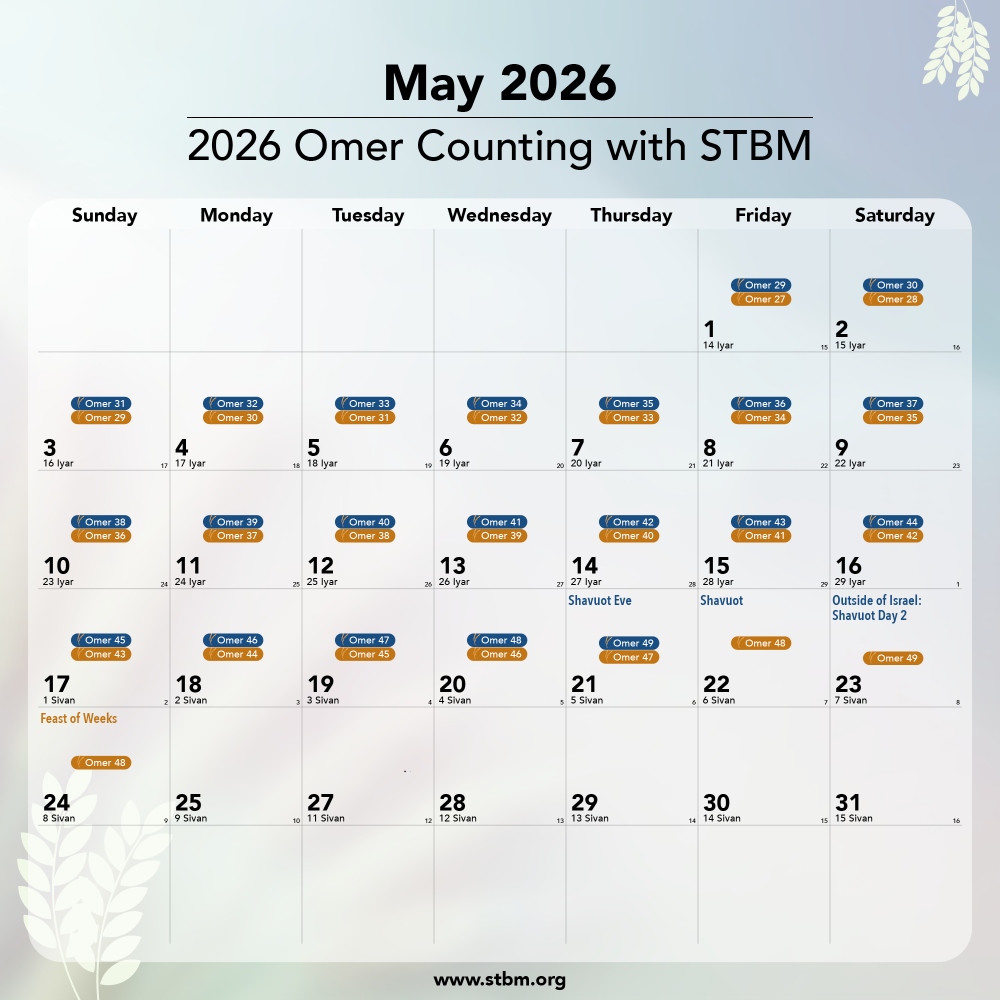You may be wondering why STBM sends out the Daily Omer Reflections the evening before the corresponding Omer day listed on the calendar above. The reason is because the Jewish day begins at sundown, which is when the counting begins for each day. However, like many Jewish calendars, ours does not indicate the Omer days on the night before. For example, you will see Omer Day 1 on April 3, but it actually began the evening before, on April 2.