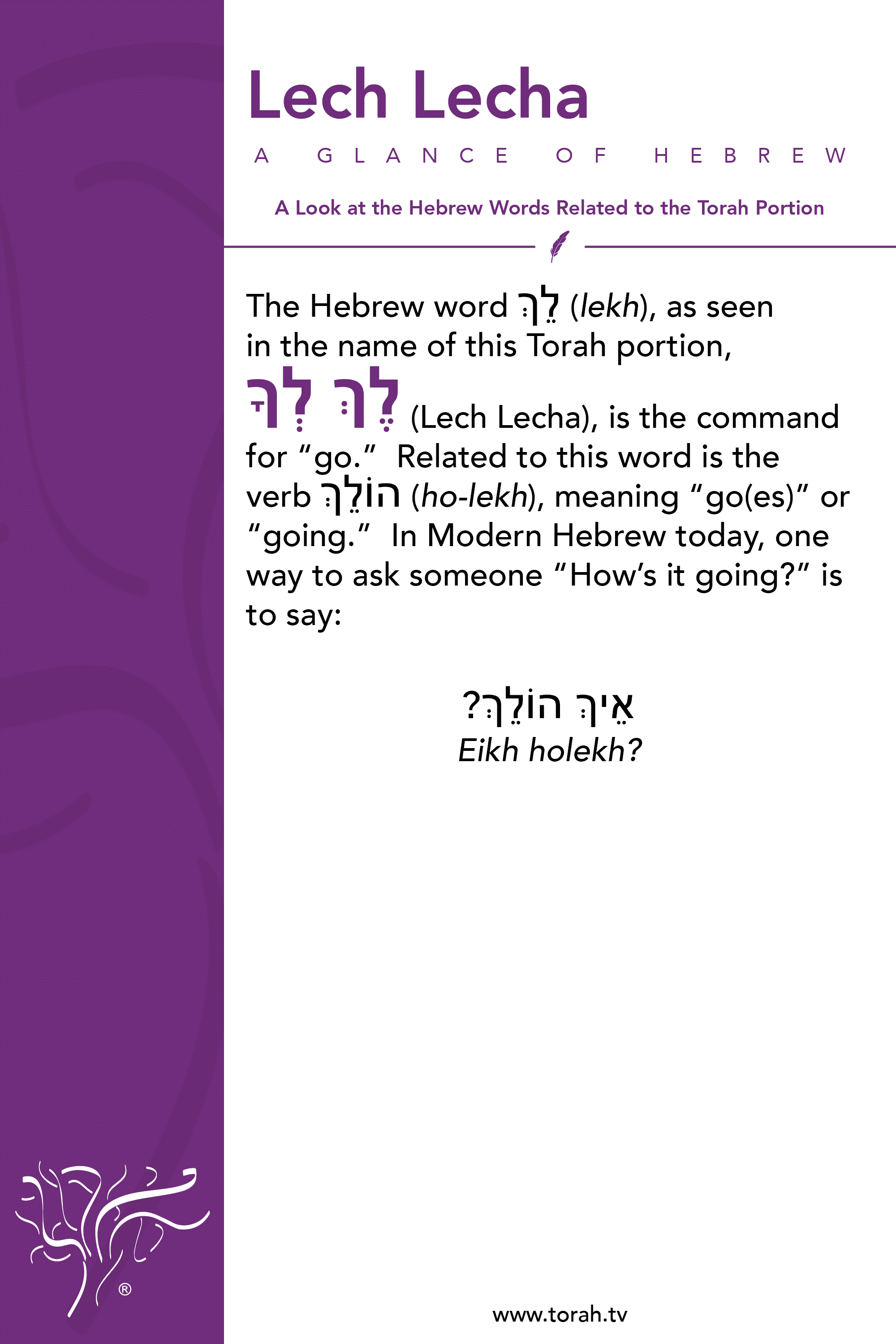 Lech lecha means “go to yourself” or “go forth within yourself.” These are the words that God spoke to Abraham when He told him to leave his father’s house and go to a Land that He would show him. Abraham took the journey, pressed forward, and became a great nation. No one else prior to him did what he did.