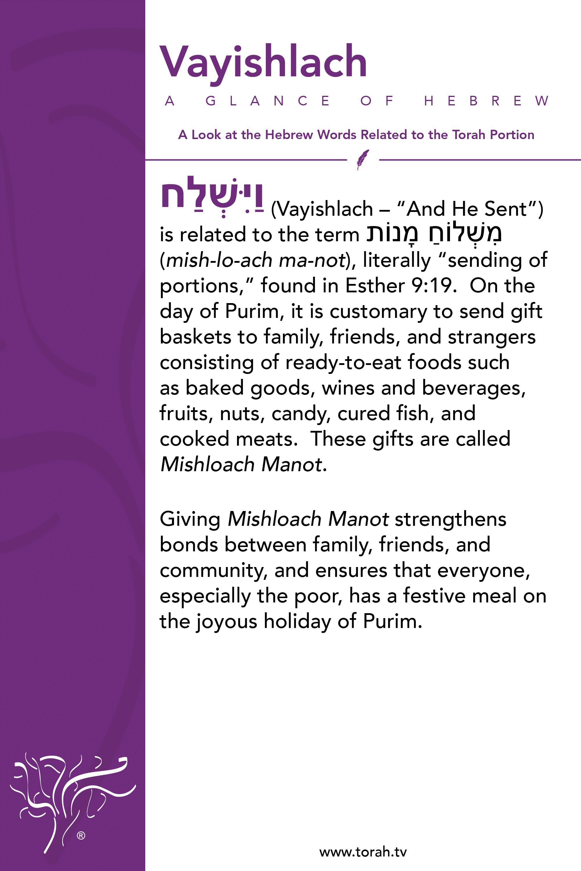 Vayishlach means “and he sent.” When Jacob journeyed back to Canaan after a 20-year stay in Charan, he sent messengers ahead to Esau with a message of reconciliation. When they returned with the news that Esau was coming with 400 men, he immediately responded with extreme fear and worry. Fearing that Esau would carry out his plan of vengeance and kill him, he came up with a three-fold plan: war (Gen. 32:8–9), prayer (Gen. 32:10–13), and appeasement (Gen. 32:14–22).